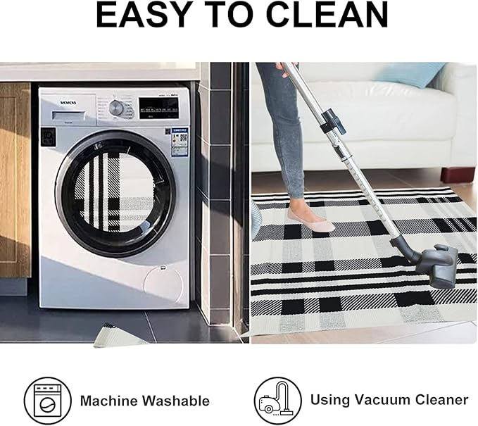 - 【CLASSIC DESIGN】:The black and white rug offers casual elegance in the form of a classic plaid pattern Keep your home beautiful and clean.