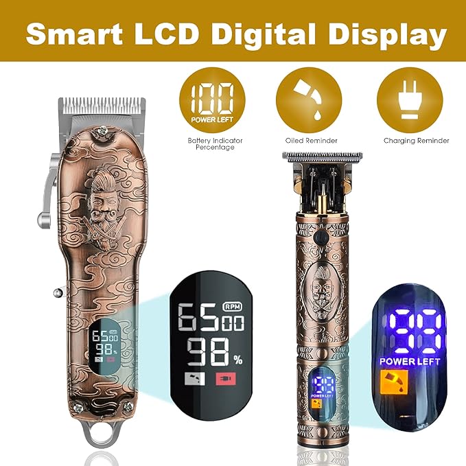 - 【Long Battery Life &Digital Display】Built-in rechargeable large capacity and safe battery, offers up to 5 hours of running time with charging 2.5 hours for the hair clipper , offers up to 2 hours of running time with charging 1.5 hours for the detailed trimmer.The LED light indicates the remaining battery power, and When charging, the current battery status is visually displayed in digital mode and promptly reminds you to charge.