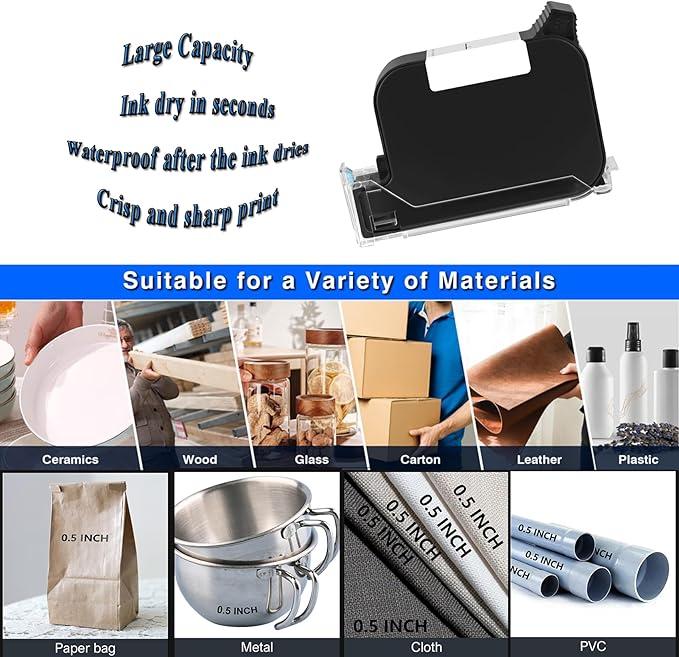 - WIDE APPLICATION: TIKTONER quick-drying ink cartridge replacement is suitable for paper, carton, wood, stone, cloth, metal, glass, medium density fireboard etc,.(NOTE: The ink is black.)