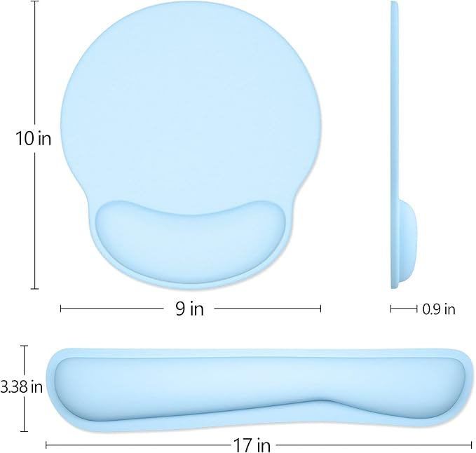 - Optimal Size: 17*3.38*0.9 inch keyboard wrist pad offers more support to your wrist, 10*9*0.9 inch large mouse pad allows your mouse to move freely. Perfect size fits most keyboards, laptops and mice