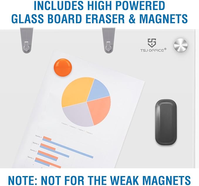 - MAGNETIC GLASS WHITEBOARD - Our glass white board comes with a multifunctional steel-backed magnetic glass and 4 high-power glass board magnets. Making this glass whiteboard perfect for meetings and presentations. (NOTE: The magnetism will not be strong due to the thickness of the glass, standard magnets do not work. The eraser is not magnetic.)