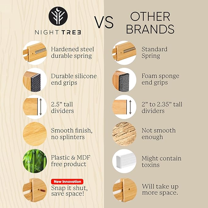 - Ultimate Adjustable Drawer Divider - NIGHT TREE bamboo drawer dividers expandable give you the opportunity for extreme organization. Gone are the days when things got thrown into a drawer with the hope that one would remember and still be able to find whatever it was later. Made of 100% sustainable and incredibly sturdy bamboo, and free of MDF and other toxic materials. These wood drawer dividers / silverware dividers - are the perfect organizational accessory.