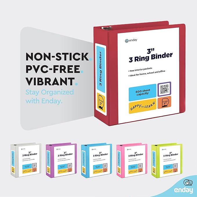 3 Inch Binder 3 Ring Binders Red, Slant D-Ring 3” Clear View Cover with 2 Inside Pockets, Heavy Duty Colored School Supplies Office and Home Binders – by Enday
