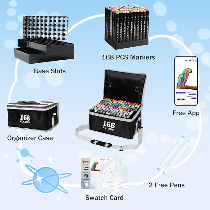 - Creative Gift- 168 colors marker set come with a durable zipper carry bag for storing and easy travel. Bottom organizers keep pens up straight in order. Markers for adulting coloring are ideal gifts for girls, artists, hobbyists, beginners. A great gift idea for Christmas,birthday and a new semester etc.