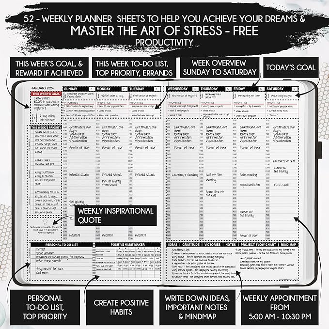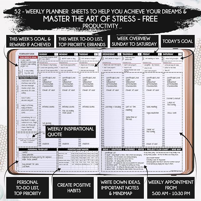 - WEEKLY & DAILY PRODUCTIVITY SYSTEM – Boost focus and happiness with this 2026 weekly planner that also works as a 2026 daily planner, goal planner, gratitude journal, and to-do list organizer. Based on the Law of Attraction framework, this 2026 planner weekly and monthly helps align your goals with actions for success.