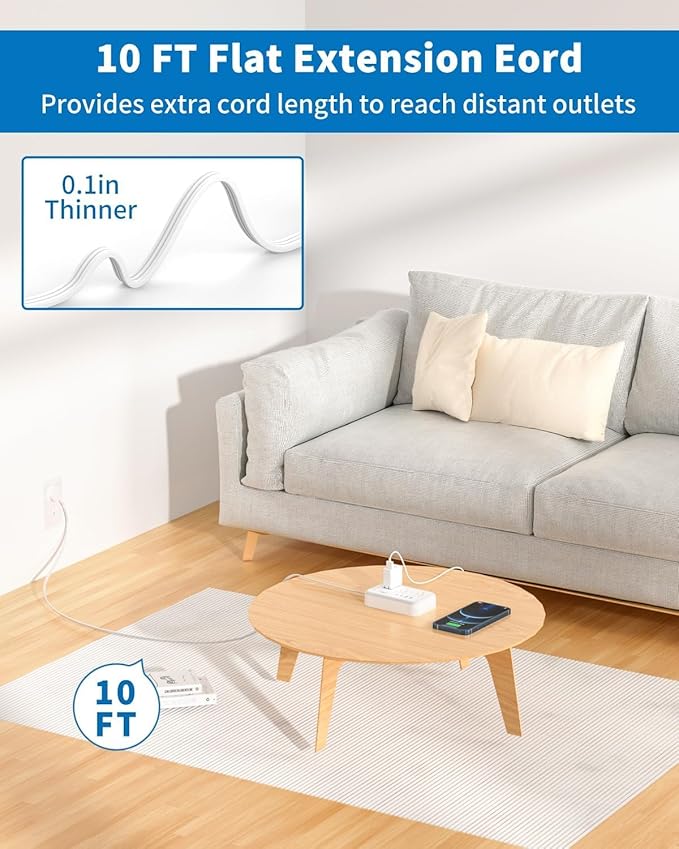 - 【 Flat Extension Cord 】 Flat power cord is thin enough to run under rugs. It's much better than the standard round extension cord and doesn't hurt when I step on that spot on the rug. With cable ties for keeping the 5 feet flat power cord organized. Multiple Flat Cord Lengths Available: (5/10FT)