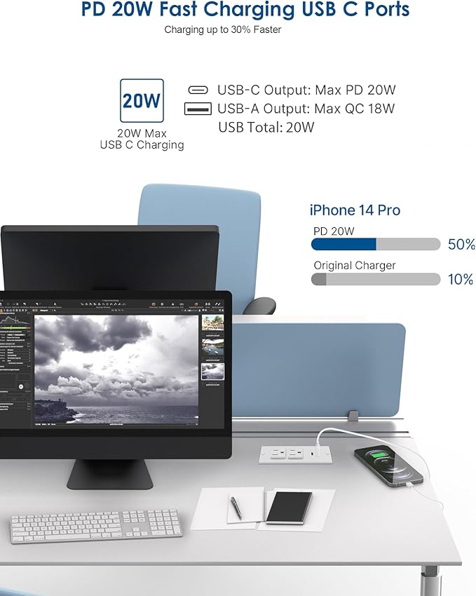 - Conference recessed power strip with 1 USB-Type C,1 USB-Type A.PD 20W USB-C Output:5V/3A, 9V/2.22A, 12V/1.66A.USB-A Output: 5V/2A in total.