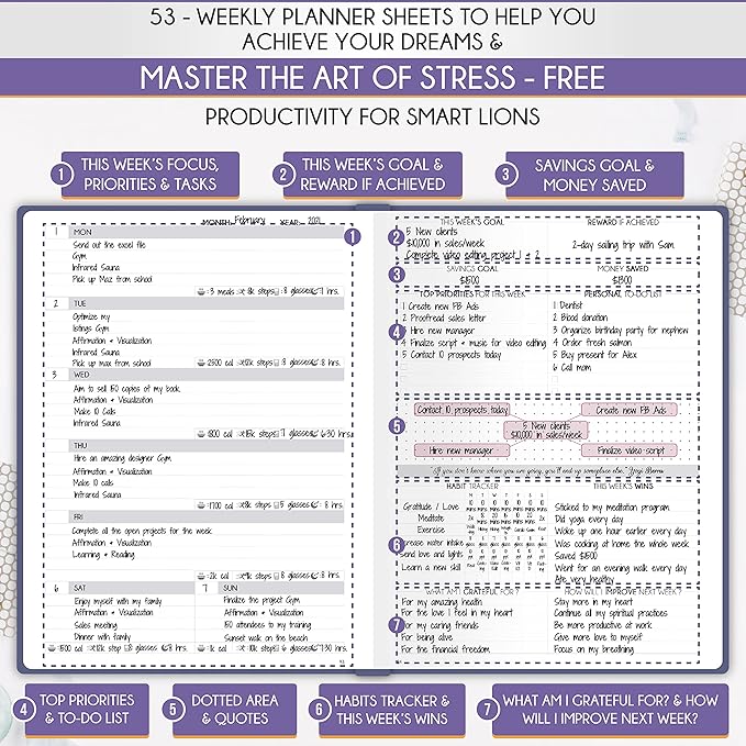 - HABIT TRACKER JOURNAL - Reduce overwhelm, tension, and procrastination by using a groundbreaking 8-step technique to reclaim your life's balance, clarity, and serenity while achieving your goals. Seize the potential of each day. This personal organizer dedicates a separate page for every day, featuring sections for scheduling, goal setting, prioritization, task lists, reflection, and ample space for notes. With its expansive large format, you possess all the room necessary for comprehensive planning.