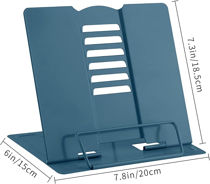 - 6 adjustment points: Length-7.3in, Width-7.8in. The cookbook holder can be adjusted to an appropriate angle through the 6 notches on the movable back support as needed, which promotes the correct posture and reduces the fatigue of long-term reading.