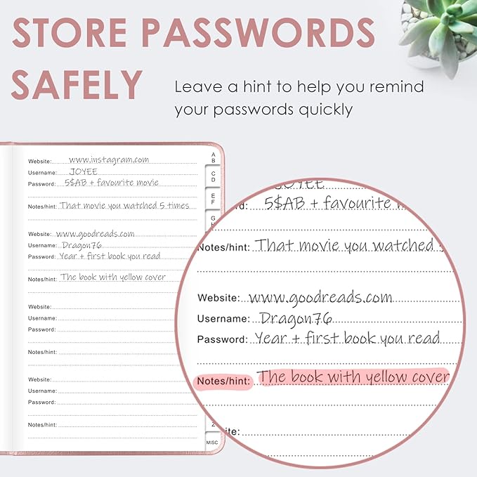 - PREMIUM QUALITY & PERFECT MEDIUM SIZE: This password journal comes with a high-quality leatherette hardcover, an elastic band, pen holder, ribbon bookmarker, and inner accordion pocket. It measures 5.2 inches wide and 7.6 inches long, which is the perfect size for your needs.