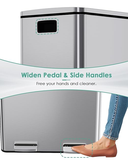 - THICK & WIDE PEDEL: Wide and thick stainless steel pedal is ergonomically designed, so you can throw out trash without bending over, and you don't need to touch the lid of the bucket when throwing out trash.