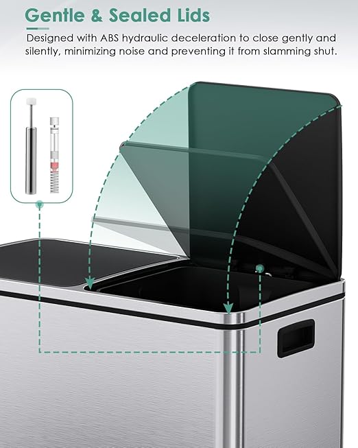 - DUAL TRASH CAN: Trash can has double compartments, which makes it easier for you to separate dry and wet trash. Each compartment has an independent lid to make the trash no smell pollution exists.