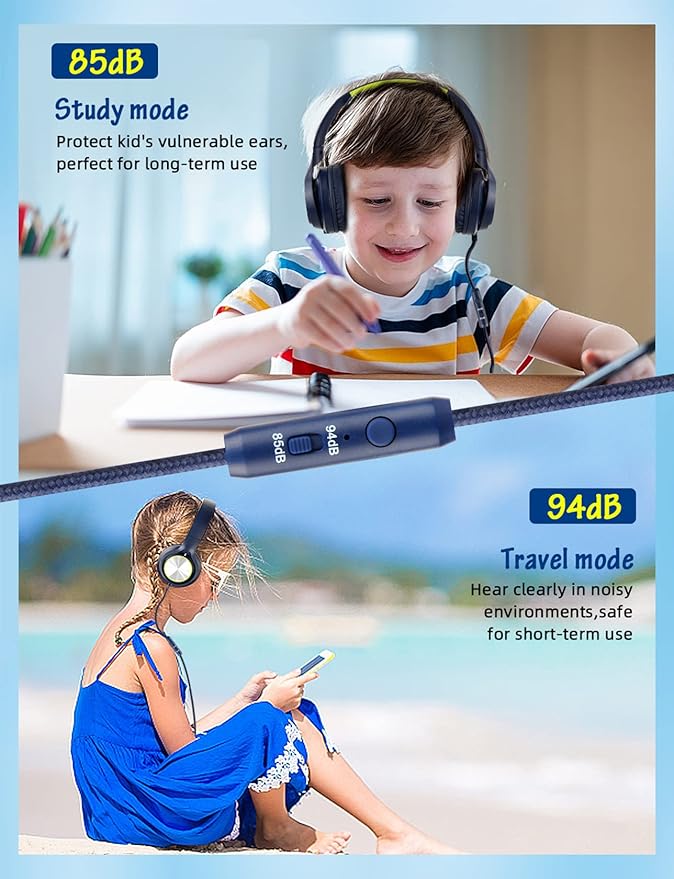 - [Kid-safe Volume 85dB/94dB Limit Switch] Designed with a volume limit switch on the audio cable, these toddler headphones protect the vulnerable and sensitive ears of kids, the 85dB volume protects in normal environments, while the 94dB volume is suitable for noisy environments such as public parks, cars, airplanes, listen to listening every melody and lyrics clearly meanwhile protecting kids’ hearing