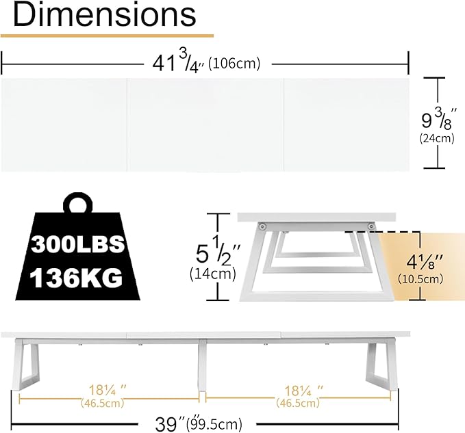- 【Sturdy and High Quality】The white monitor stand built with heavy-duty steel and premium MDF wood - holds up to 300Ibs. Features anti-wobble crossbars & anti-skid rubber pads, this white desk riser offers exceptional stability for 2 monitors or heavy setups.