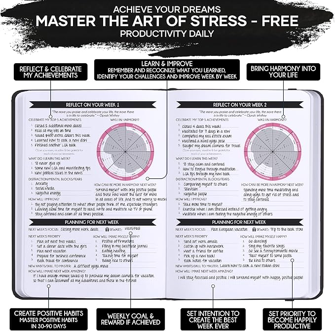 - LUXURIOUS AND TOP QUALITY - Self-care journal for women and men, perfect for entrepreneurs, professionals, college students and everyone who has burning desire to turn dreams into reality! FREE VIDEO MINI-COURSE: You will learn 10-min morning routine used by the most successful people to 10-fold your productivity, focus, happiness & passion! You will master setting goals & fix procrastination!