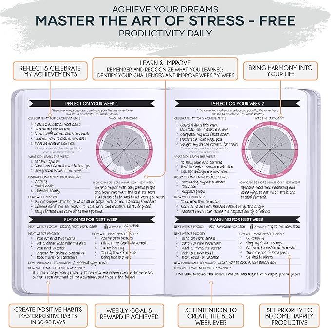 - LUXURIOUS AND TOP QUALITY - Self-care journal for women and men, perfect for entrepreneurs, professionals, college students and everyone who has burning desire to turn dreams into reality! FREE VIDEO MINI-COURSE: You will learn 10-min morning routine used by the most successful people to 10-fold your productivity, focus, happiness & passion! You will master setting goals & fix procrastination!