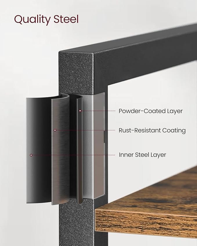 - Embrace an Industrial Vibe: The rustic brown shelves paired with a black steel frame create a stylish industrial look, allowing this freestanding shelf to fit seamlessly in with your home decor and give your space an instant update