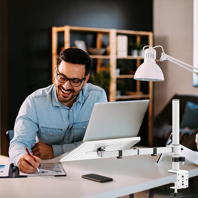 WALI Laptop Mount Arm for Desk, Laptop Tray, Fully Adjustable, up to 17 inch, 22lbs, with Vented Cooling Platform Stand (M00LP-W), White