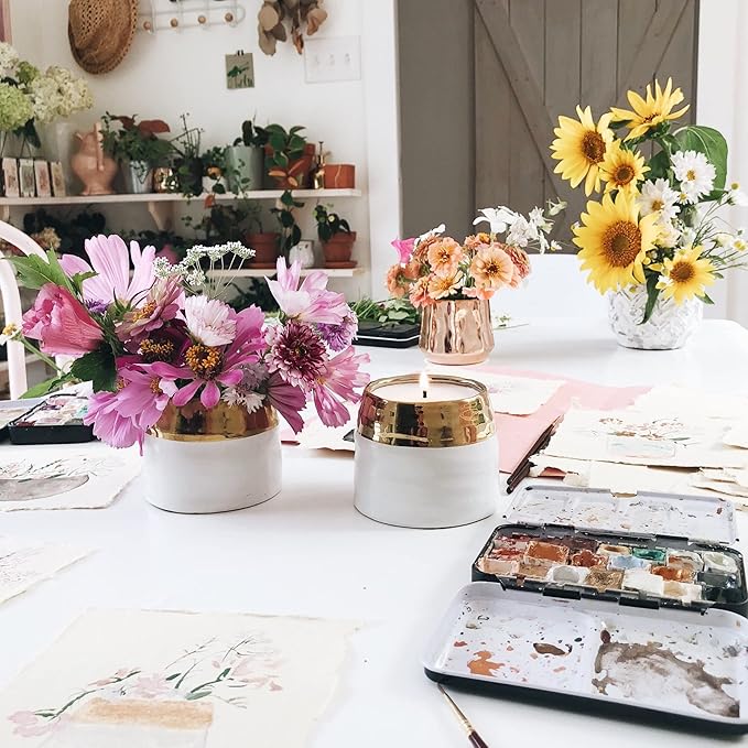 - QUALITY CONTAINER: Featuring a hand-made Gold/White Ceramic design, the 10oz (295ml) Clara container brings style and function to your home; infuse your space with eucalyptus candles with clearance, then reuse the pot to grow wildflowers after the wax is gone