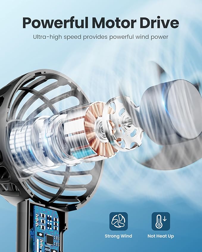 - Powerful wind & 3-speed setting: Built-in powerful brushless motors, which can generate strong wind; The hand fan has 3 adjustable wind speeds, press it for low-speed 3500r/m, medium speed 4500r/m, and high-speed 7500r/m