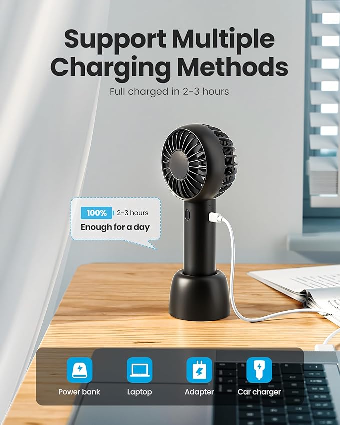 - Handheld Fans or Desktop Fans: Can work stably and continuously while charging, use the lanyard(included) to hold the fan without worrying about it slipping off; put in the base (included) and it can become a small desk fan