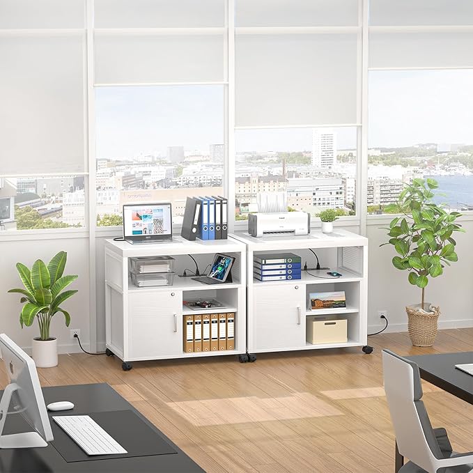 Unikito Rolling File Cabinet Lateral Office Filing Cabinets with Socket and USB Charging Port, Modern Printer Stand on Wheels, Printer Cabinet with Door and Open Storage, Lockable, White