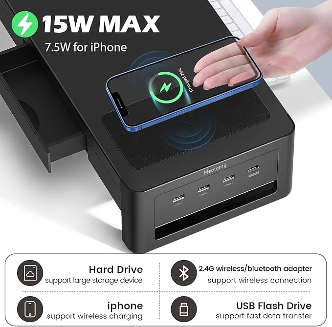 - 【Wireless Charging Module】With Max 15W wireless charger, Meatanty monitor stand makes charging more convenient by simply putting your phone on the charging area.Tips: If your iPhone is properly placed on the wireless charging pad but still can't be charged, please reboot your phone.