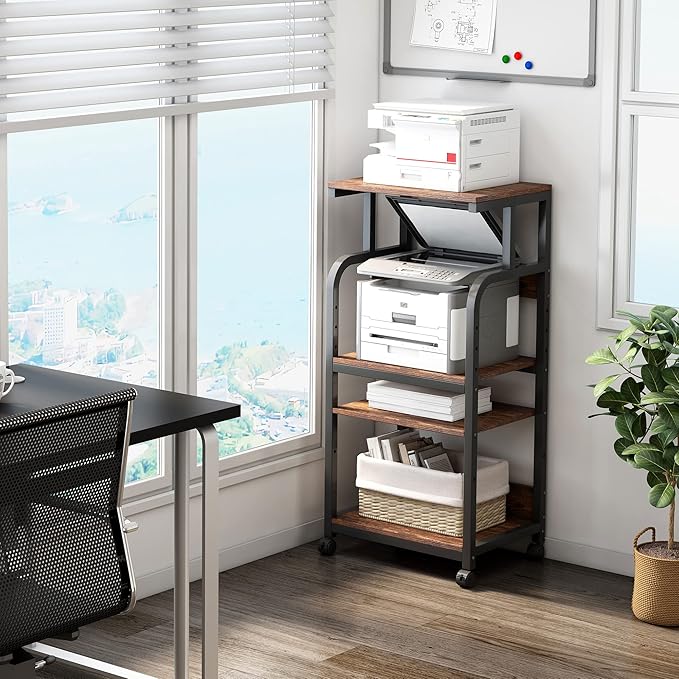 4-Tier Printer Stand with Adjustable Storage Shelf, Large Tall Printer Table with Wheels for Home Office Small Spaces Organization, Rustic Brown