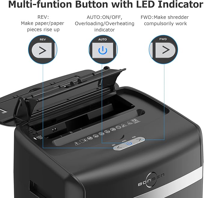 - Two Different Shredding Mode: BONSEN paper shredder designed with Auto & Manual modes; 120 sheets automatic shredding (only for paper) and 12 sheets manual shredding capacity (shreds paper, clips, staples and credit card)