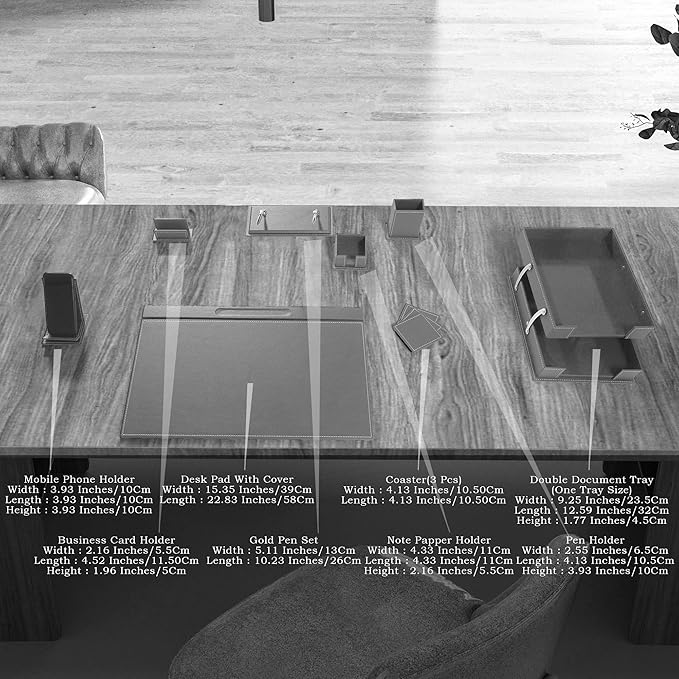 - We are offering you the opportunity to find the office accessories that you need, conceived by our finest leather artisans. Made with authentic leather and in a unique palette of colors, you will definitely add a distinct touch of class to your office decor. Our leather office sets are also well coveted among professionals who use them in conference or meeting rooms.