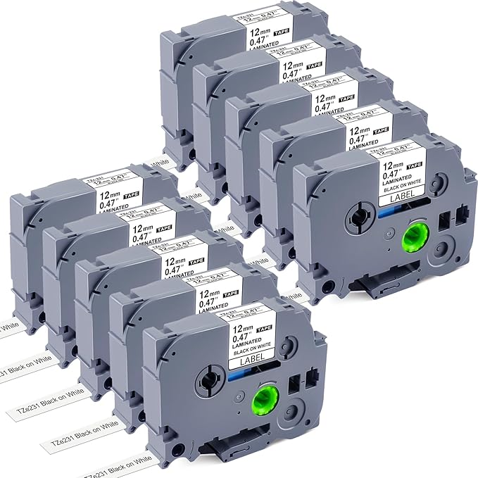 - Package: A total of 10 pieces label maker tape tze-231TZe231 TZc-231 TZ-231; TZe label tape is 12mm (1/2") x 8m (26.2'), 10 Pack total 262 Feet (80m); Color: Black Print on White