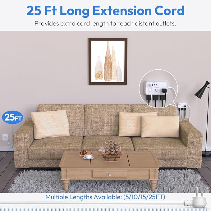 - 【 25 ft Extra Long Extension Cord Flat Plug 】The 25 ft power strip to the white extension cord provides extra outlets at optimal reach in home and office spaces. The right angle flat plug power strip is easier for cable management when plugged into the wall or behind furniture, which saves the space.