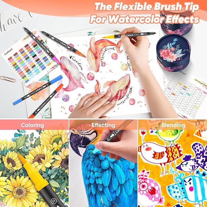 - DOUBLE TIPS, DOUBLE CREATIVITY, DOUBLE FUN! WHY CHOOSE Caliart 72 brush marker pens set? We’re different! 1. Double tips, 72 markers, 144 nibs, brush & fine tips! 2. Color coded & numbered penholder easier to choose right color every time. 3. Well selected vibrant colors, NO duplicate. 4. Minimal to No Bleed Thru most paper! 5. Caliart Premium High Quality Control Promised! 6. With Caliart NO-WORRY 100% Satisfaction Warranty!