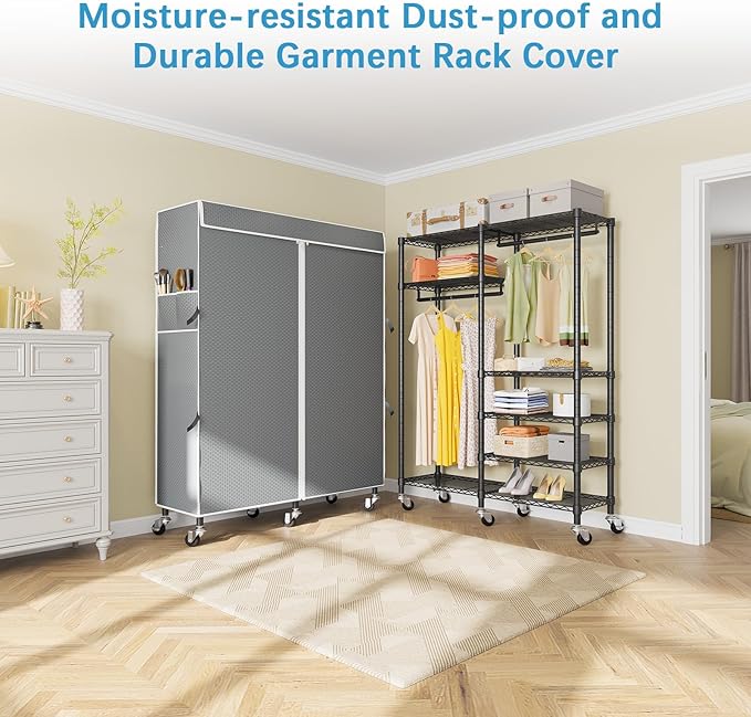 VIPEK R4C Rolling Garment Rack 6 Tiers Adjustable Heavy Duty Wire Shelving Portable Clothes Rack with Lockable Wheels, Black Metal Clothing Rack with Grey Upgraded Polyester Cover, Max Load 620lbs