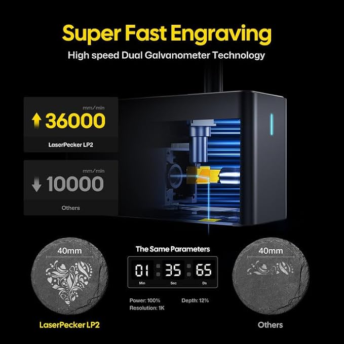 - Lightning-Fast Engraving: 36000 mm/min speed + instant previews (225000 mm/min) powered by galvo tech. Finish projects 3-5x faster than standard engravers.