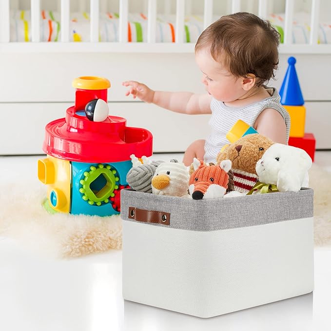 DULLEMELO Storage Baskets for Organizing, Shelves,Bedroom, Decorative Storage Bins with Leather Handles, Fabric Storage Basket for Office, Toys(3-Pack Medium-15 inch X 11 inch X 9.5 inch , Grey&White)