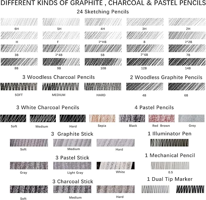 - Versatile Pencils: Contains 24 shading pencils (6H-14B), 3 charcoal pencils, 3 white charcoal pencils, 3 woodless charcoal pencils, 2 woodless graphite pencils, 4 pastel pencils for various tones and effects.