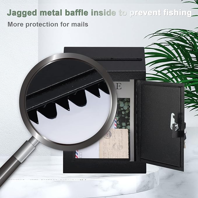 - 【SAFETY STORAGE】 - The mailbox is designed to prevent fishing with a jagged metal baffle inside. It comes with 2 keys and a secure latch that can keep your letters in a safe space.
