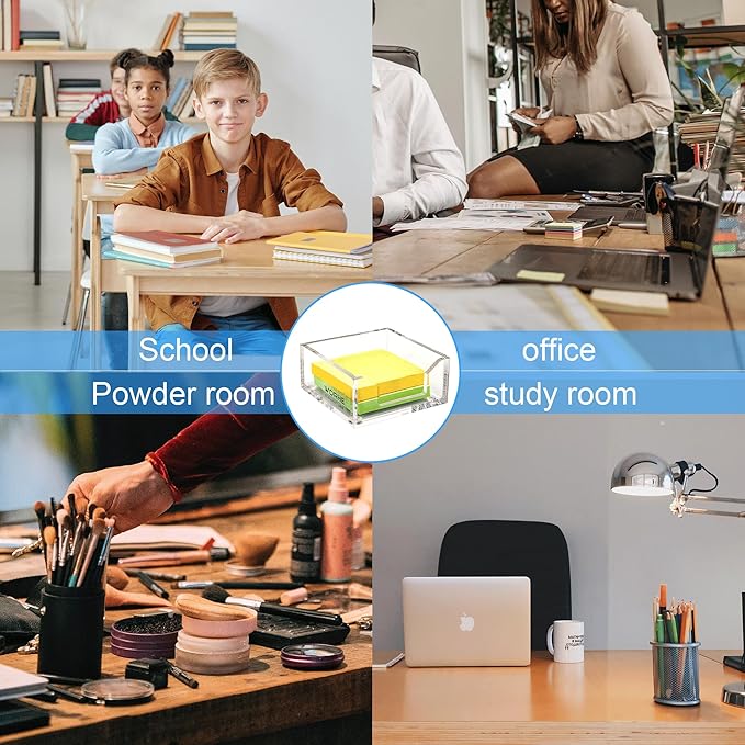 - Versatile: Highly transparent acrylic with carefully polished edges, the modern and simple design of this note dispenser matches a variety of styles of office decor. Designed for desk storage of office supplies, as an office or school stationery organizer, handy for holding sticky notes and clips, hair ties, lipstick or kitchen tools, etc