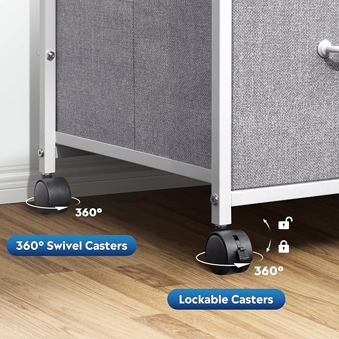 - Easy to Move: Rolling on 4 wheels, this mobile file cabinet can fix or move around your home office freely. Built-in brakes on front 2 casters to keep it in position and add stability. Unique fabric drawer design makes it only weigh 22 lbs. and light to move.