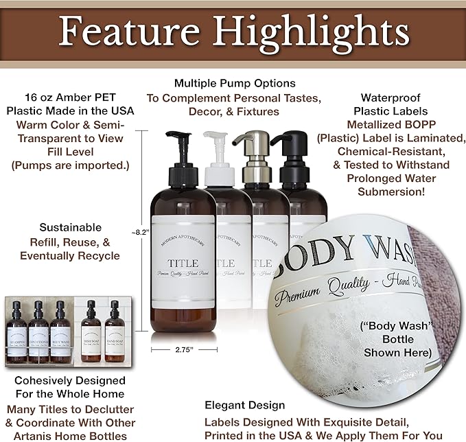 Amber PET Plastic Refillable Hand Sanitizer Pump Bottle Dispenser with Black Plastic Pump, 16 oz with Waterproof Label, Empty Reusable Container for Home, Kitchen, Bathroom, Office, Business