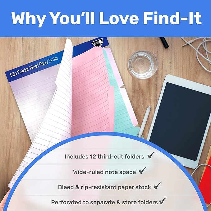 - 12 FOLDERS - Enjoy 12 assorted third-cut file cabinet folders in each pad. The perforated top allows you to simply tear and file your notes easily and efficiently.