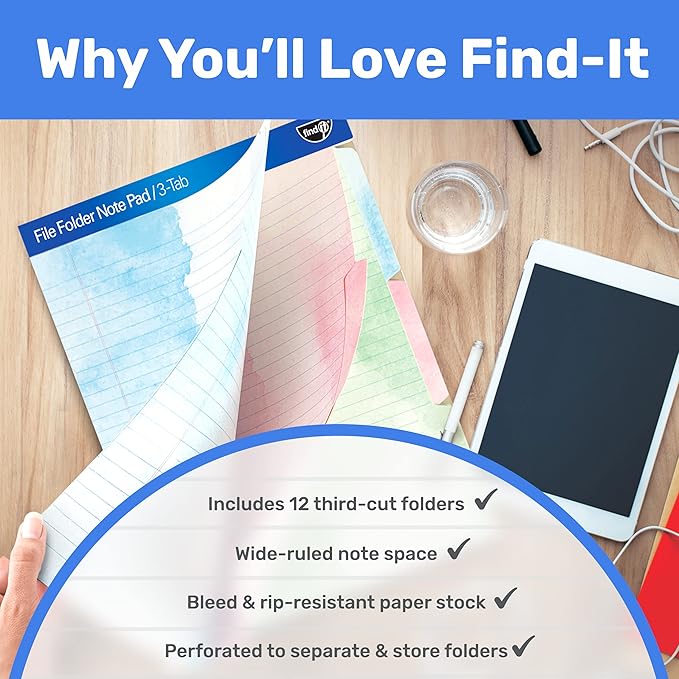 - 12 FOLDERS - Enjoy 12 assorted third-cut file cabinet folders in each pad. The perforated top allows you to simply tear and file your notes easily and efficiently.