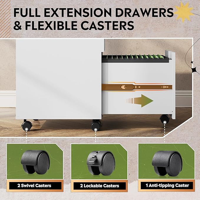 - GENEROUS STORAGE: This small file cabinet has 3 spacious drawers. You can pull all your essentials inside, like printing paper, pens, books, or even snacks. The bottom drawer with Adjustable hanging rails to accommodate letter/ A4/legal size files. The drawers are on ball-bearing (full extension) glides. Drawers open completely, allowing you to easily get to all contents, even in the very back.