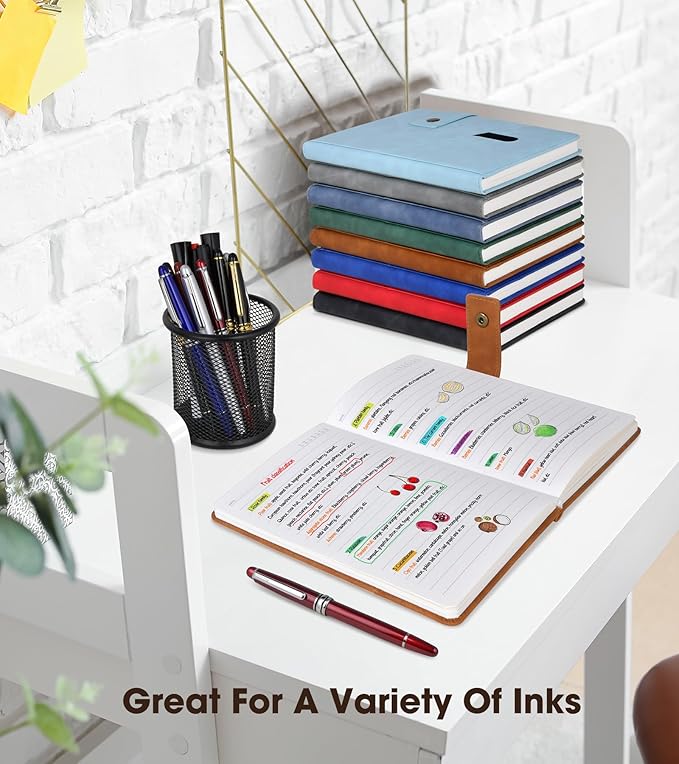 - 【PREMIUM THICK PAPER】:5.9 X 8.4 inch journal notebook with 200 pages 100 gsm lined paper, thicker 30% than normal, this brown notebook is designed to avoid feathering and the paper is ink-proof, suit for most pens, but the wettest pen inks. Archival-quality pages made from acid-free paper-resists damage from light and air, the cream paper is easy on eyes.Let your creation more freedom on the wide ruled journal to write in.