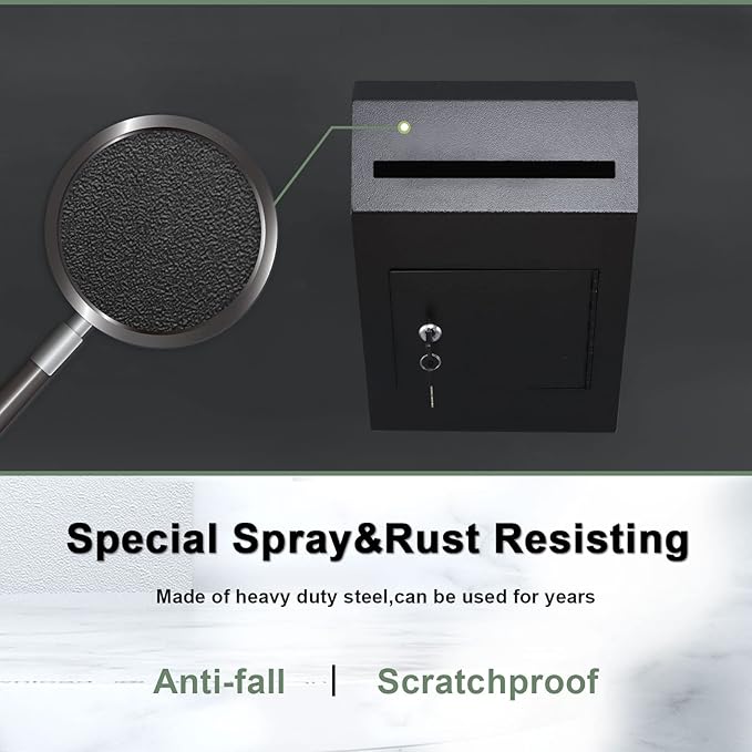 - 【DURABLE MATERIAL】- xydled’s Drop Box is made of powder-coated heavy-duty steel to ensure durability and long life, and provide high-security protection and safe storage for your mails. The black textured surface is not only scratch-resistant and modern as well as beautiful.