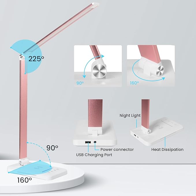 LED Desk Lamp with Night Light, Fast Wireless Charger, USB Charging Port, 10 Brightness, 5 Color Modes, Dimmable Bedside Table Lamp for Bedroom, Touch Control, Auto Timer, 1200Lux Super Bright