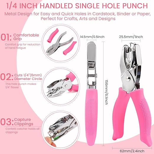 - DURABLE METAL CONSTRUCTION: Handheld single hole punch is made with all-metal construction and features an anti-slip soft rubber grip. The hole puncher is ergonomically designed with cushioned grips which are more comfortable for frequent use. Punches 1/4 in flower shaped holes in paper, thin plastic, foam, cardstock, etc.