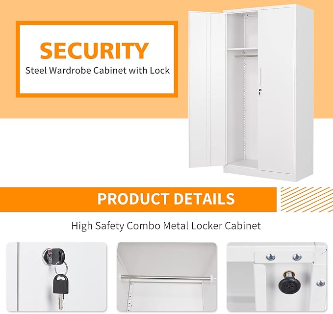 - 【Metal Locker Cabinet with Doors】2 doors is lockable for security. Handles design with core-removable lock provides a three-point locking system that locks the top, bottom and doors to keep your items secure.