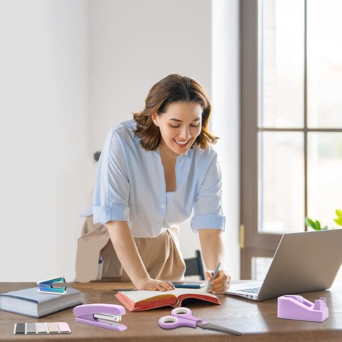 - 【Quality Materials】The purple office supplies are made of high quality plastic. Look cute, fashionable and shatter-resistant. The stapler and tape dispenser set can help you work quickly. The uniform color shape design makes your desktop look neater and more comfortable.